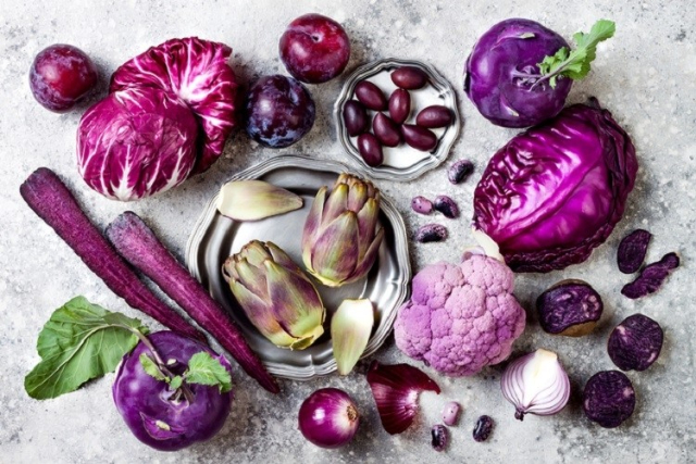 Buah dan sayur bewarna biru atau ungu – di antaranya blueberry, raspberry, bit, prune, dan terung.