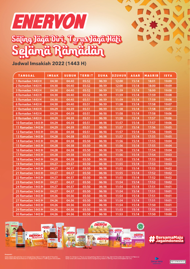 Enervoners, menyambut momen ibadah puasa, Kementerian Agama RI telah menerbitkan jadwal imsak Bulan Ramadan 1443 Hijriah yang akan jatuh pada Sabtu, 2 April 2022 mendatang. Penetapan ini dilakukan melalui Maklumat Nomor 01/MLM/I.0/E/2022 tentang Penetapan Hasil Hisab Ramadan, Syawal, dan Zulhijah 1443 Hijriah.