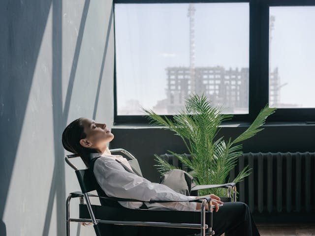 Photo by Mikhail Nilov: https://www.pexels.com/photo/a-person-in-white-long-sleeves-resting-on-a-chair-near-potted-plant-7680185/